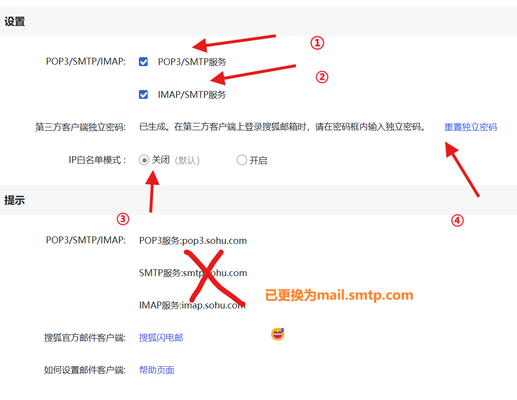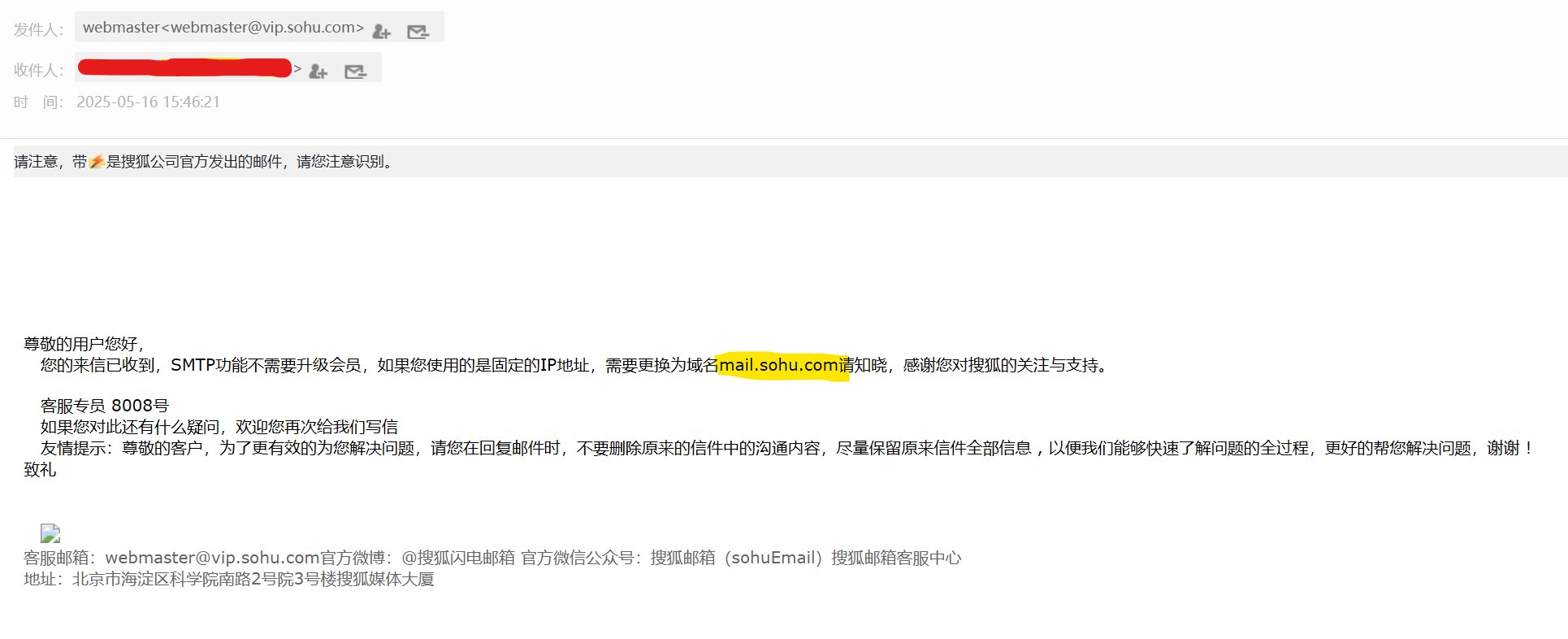 SOHU邮箱已于近日将smtp.sohu.com域名接口更换为mail.sohu.com